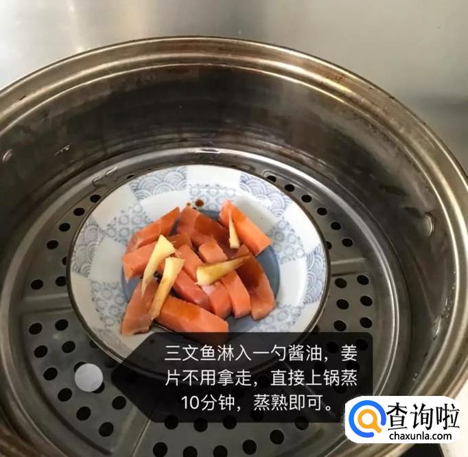 然后三文鱼淋上一勺酱油并盖上几片姜片,上锅蒸十分钟,如下图所示。