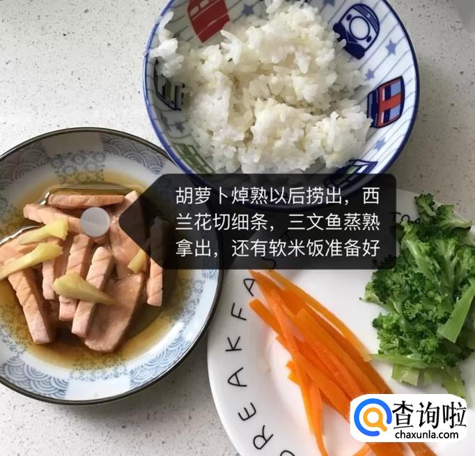 首先准备好要用的胡萝卜、海苔片、西兰花、三文鱼和米饭,如图所示。