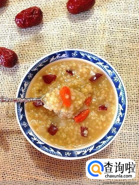 小米,红枣,枸杞,红糖,首先,把小米淘干净,红枣,枸杞洗干净,等小米熬开后再加上红枣枸杞,放进去熬,由大火转为小过,大概熬十几分钟出锅时加入红糖即可,有营养补血功效。