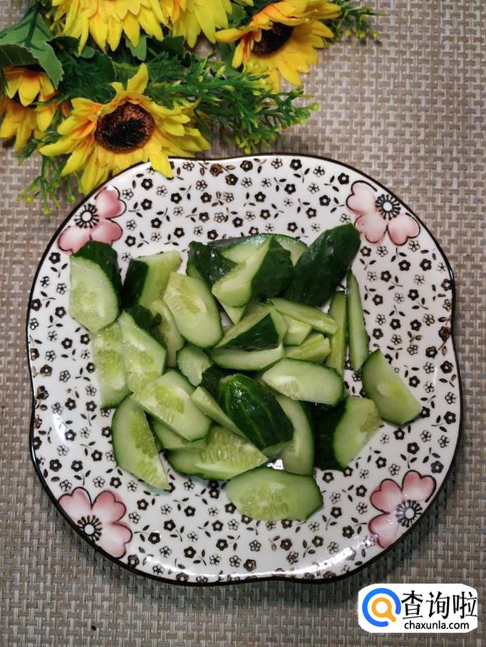 准备适量黄瓜,洗净后,切成滚刀块,放入盘中备用。