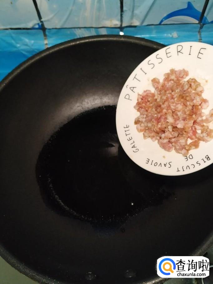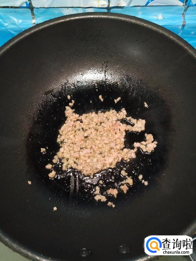 炒锅中,放入适量油,油热后,将肉末倒入锅中,翻炒均匀,炒至肉末表面发白,就差不多了。
