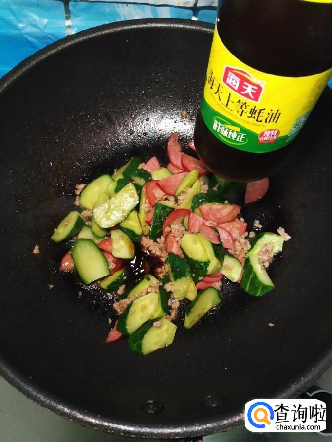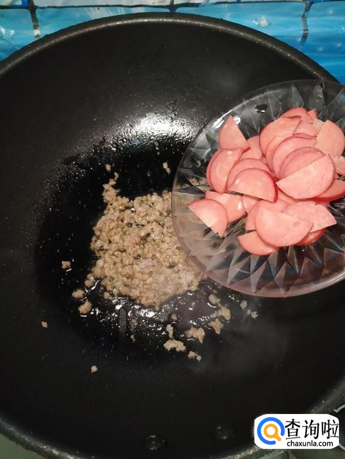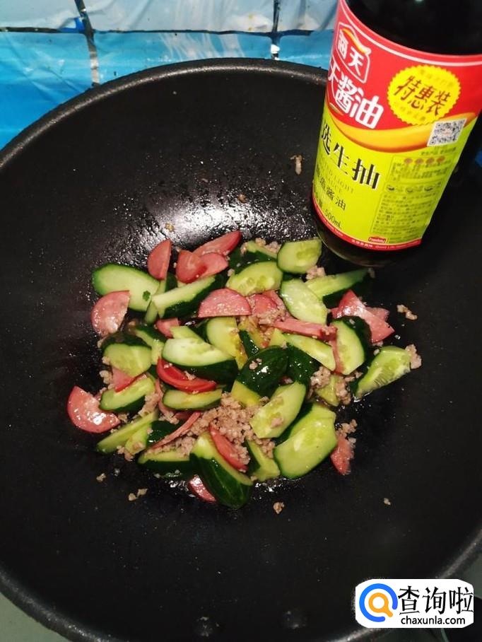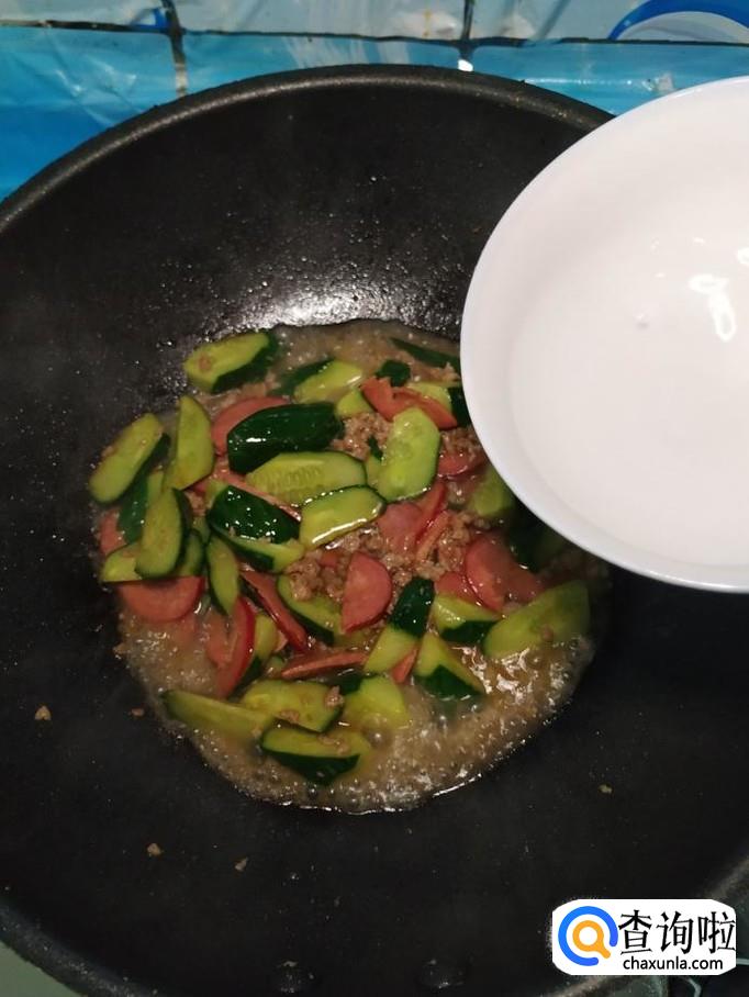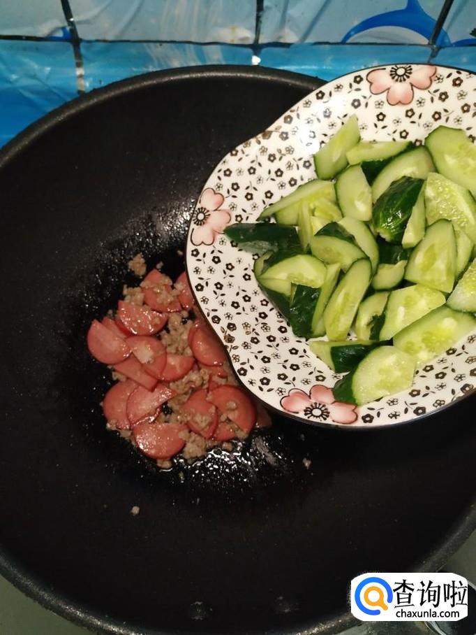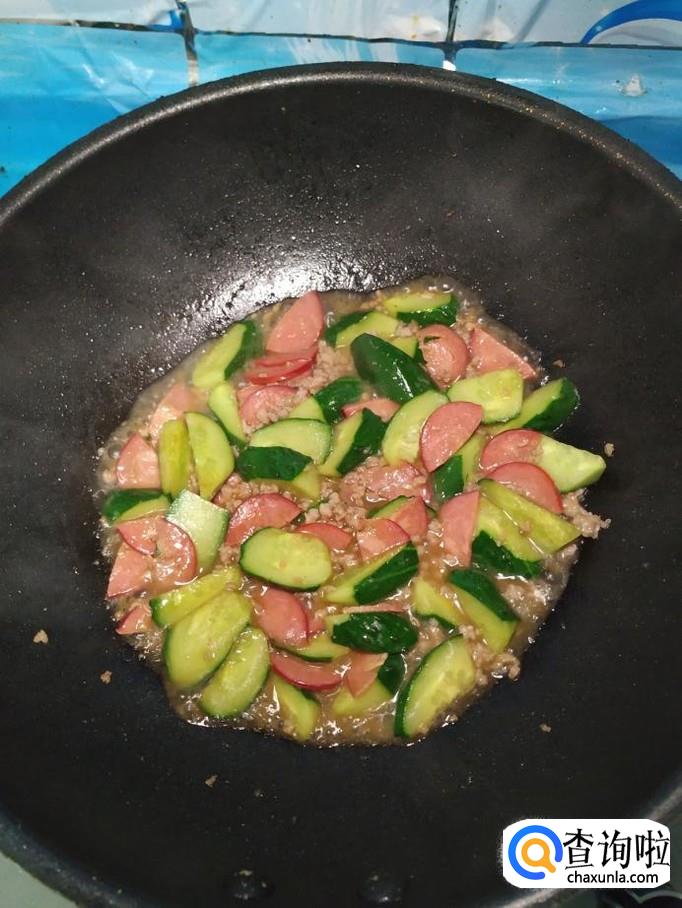 将切好的红肠和黄瓜倒入锅中,翻炒均匀。