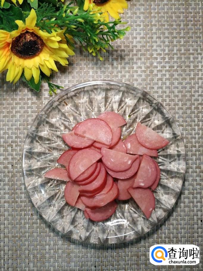 准备适量红肠,洗净后切成片,放入盘中备用。可以将红肠先劈成两半,再切成半圆形。