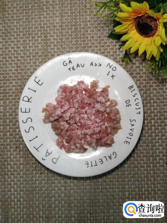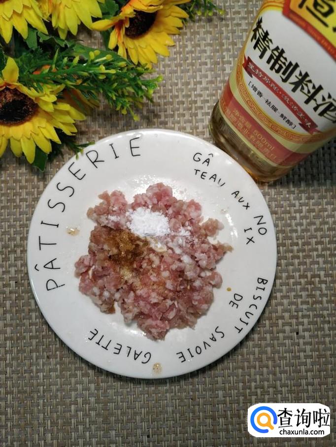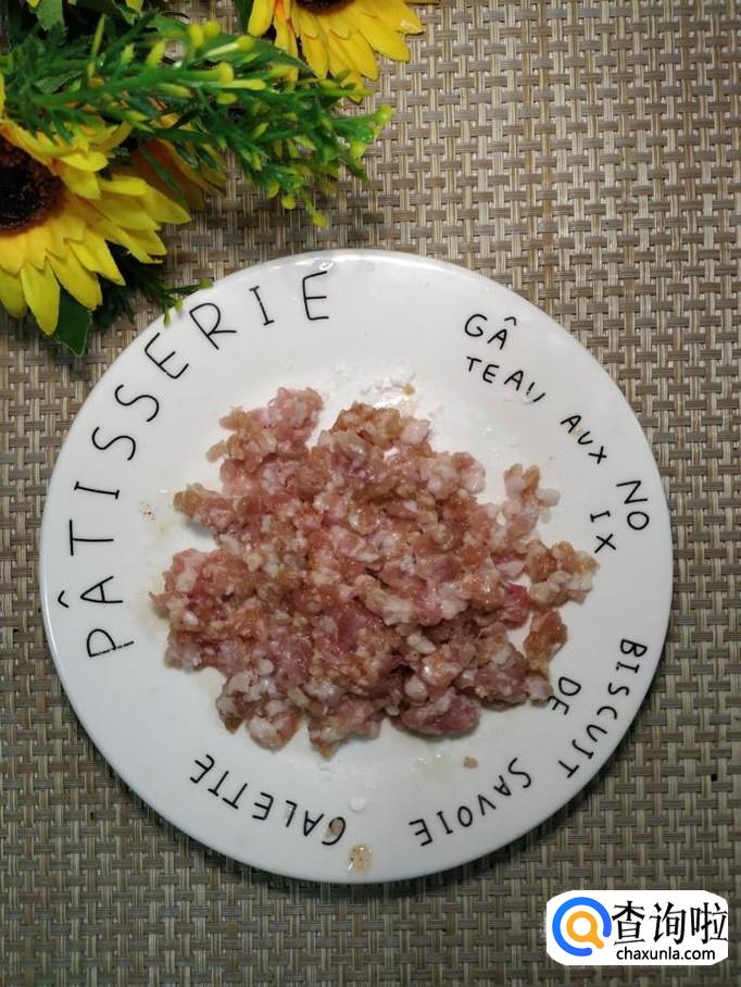 准备适量五花肉,洗净后,剁碎,放入盘中备用,再放入适量盐,鸡精,五香粉,生抽,料酒,淀粉搅拌均匀,腌制十分钟。