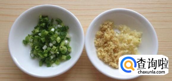 把洗干净的葱切成小段,把蒜和姜切成末,放在小碗中备用。再切两个小的干辣椒。