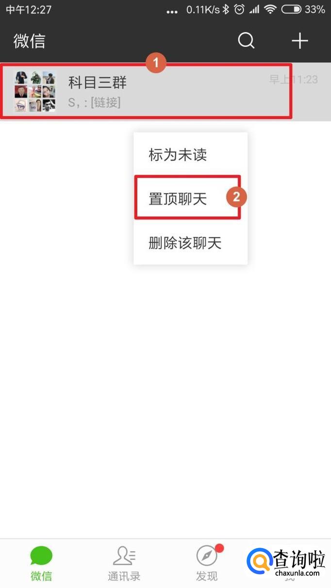 首先聊天目录中找到群聊。按住它 会弹出“菜单”后单击“置顶聊天”。