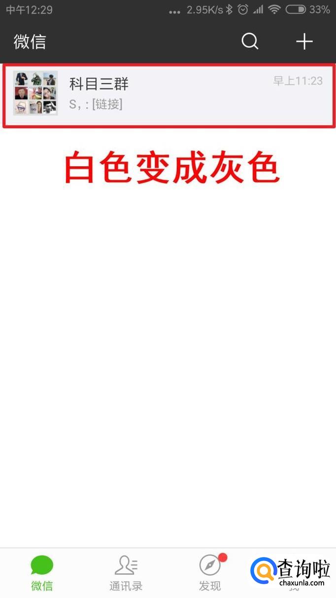 设置为“置顶聊天”后微信目录里的群聊背景颜色变灰色。这样群里永不消失的微信目录中。