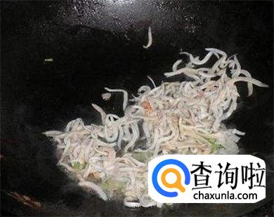 将葱切成小段,锅中放油,烧热后,放入葱花炝锅,然后倒入银鱼翻炒。