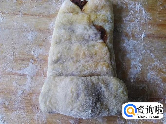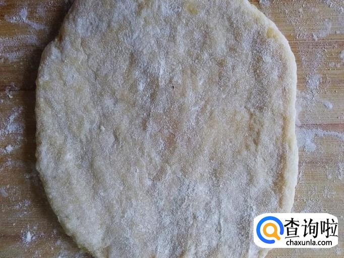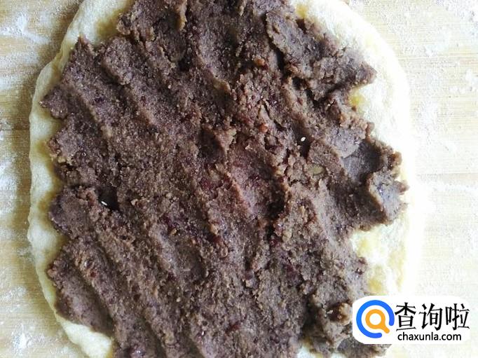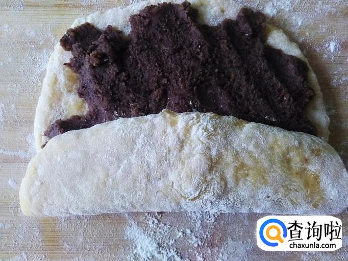 然后用轮棍压轮成大饼,再把豆沙铺在上面。