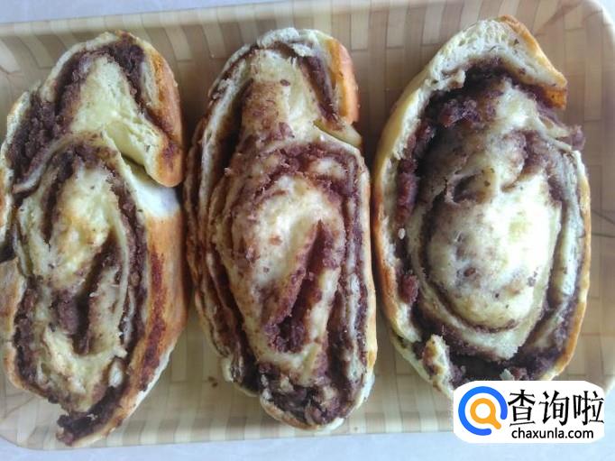 然后把考好的包卷拿出来切成一片就可以食用了。
