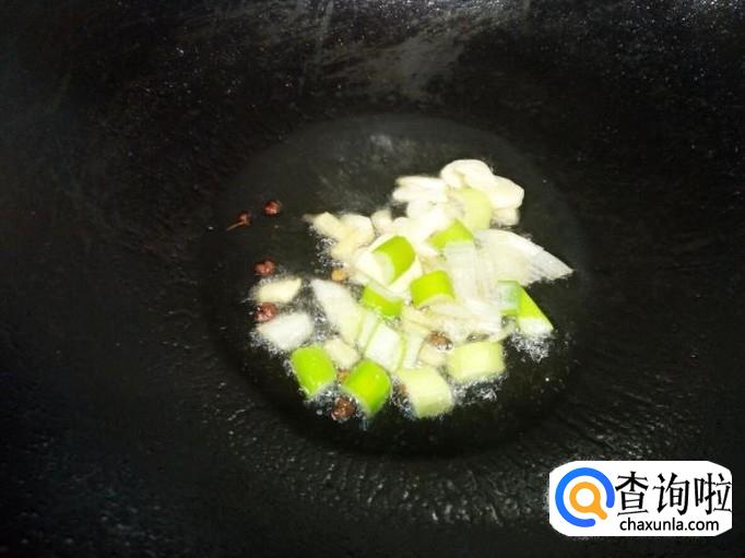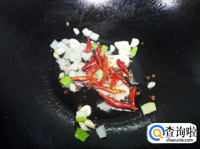 盛出炸鱼用的多余的油,锅里留底油,放入花椒,葱,姜,蒜爆锅,放入红干椒翻炒。