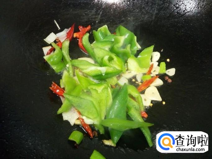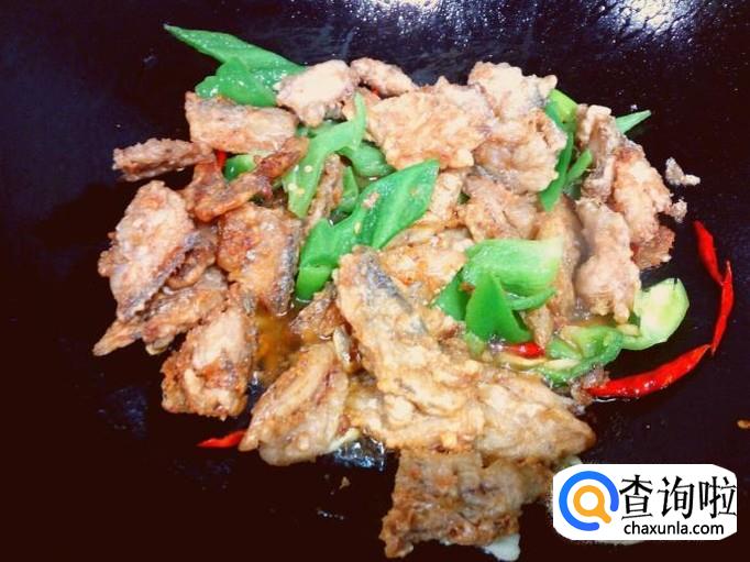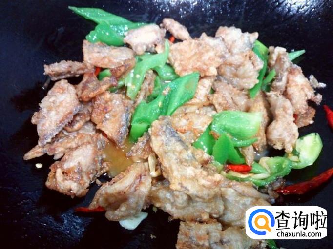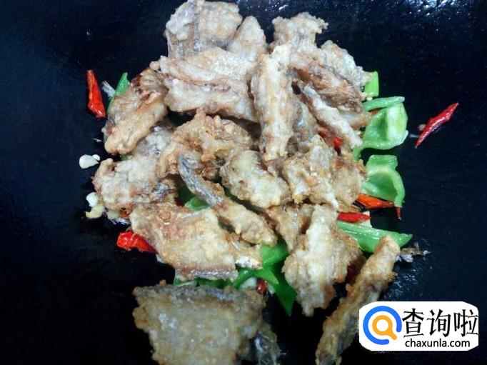 红干椒略翻炒一下,放入青椒翻炒。炒至青椒断生,放入炸好的刀鱼稍翻炒一下,放入调和好的料汁。