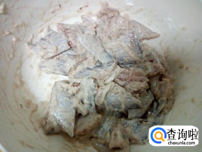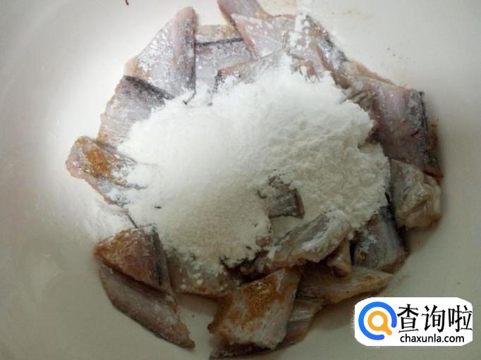 把腌制好的刀鱼放入2比1的面粉和淀粉(面粉2,淀粉1),拌和均匀挂糊。