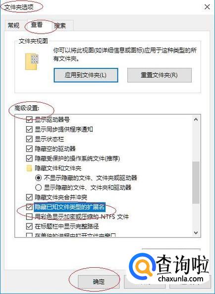 弹出"文件夹选项"对话框,如图所示。选择"查看"标签,取消勾选"高级设置→隐藏已知文件类型的扩展名"复选框。