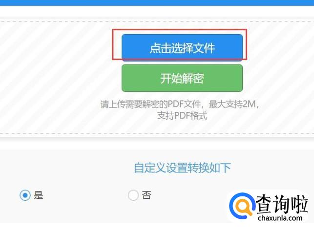 接下来,点击页面中的“点击选择文件”按钮,然后选择加密的PDF文件,文件大小不可以超过2M。