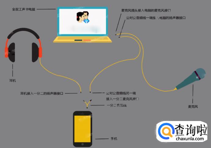 将手机跟电脑连接,手机端一分二线上的麦克风孔连接公对公音频线的一边,另一边连接电脑端的耳机,手机端一分二线上的耳机孔连接耳机,电脑端的麦克风孔连接麦克风。