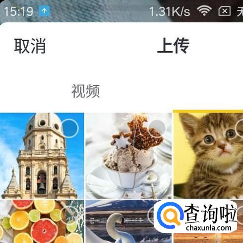 手指点一下这个图标,调出上传图片的界面,界面中显示着手机上储存的图片。