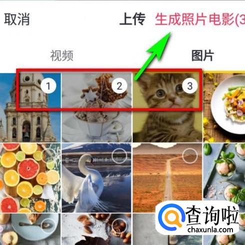 每张图片的右上角都有空心圆圈,手指点一下此处,即显示出数字,按点的先后顺序排列,1、2、3;在这里我以选中三张图片为例。