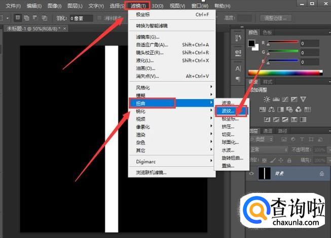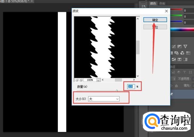 点击菜单栏中的“滤镜',选择’扭曲”中的'波纹”,将数量调大一点,大小选择“大”,如图所示。