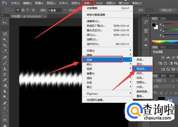 最后,选择菜单栏中的“滤镜”,点击“扭曲”中的“平面坐标到极坐标”。我们会看到,画布上出现了一个超炫酷的光圈。
