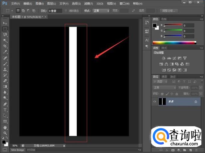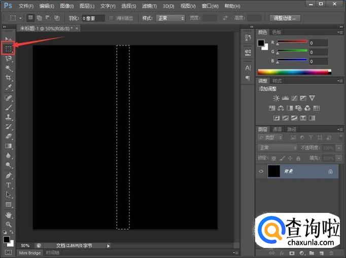 点击工具栏中的矩形选框工具,在画布的中间用鼠标拖出一个如图所示的矩形。