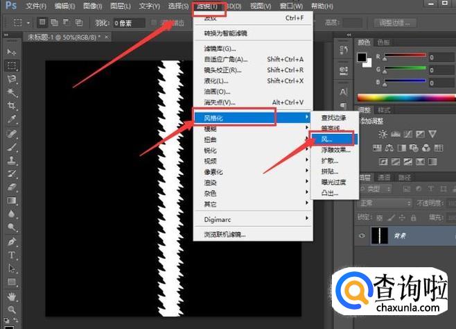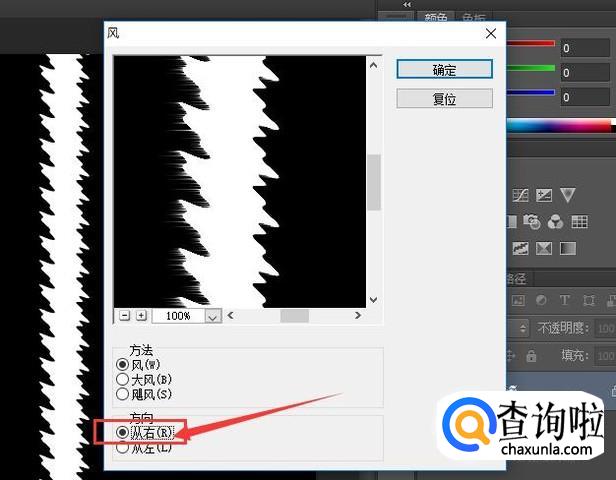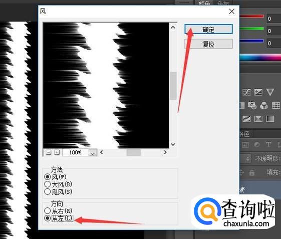 选择菜单中的"滤镜‘中的“风格化—风”,选择方向向右,点击确定,然后再重复操作一次,同理,两次选择方向向左。