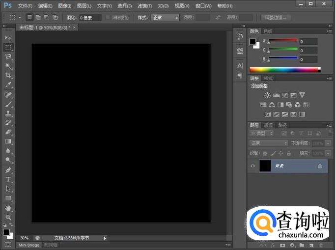 打开Photoshop,新建一个正方形画布,按alt+delete键填充背景色为黑色。