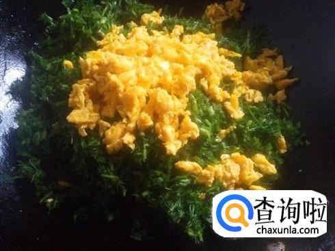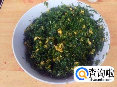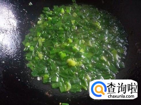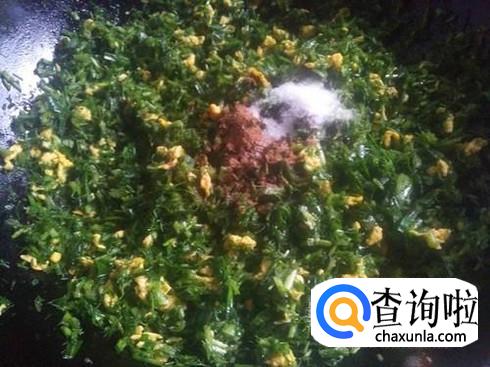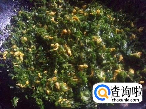 油温变凉后,放入韭菜,荤香和鸡蛋搅匀。