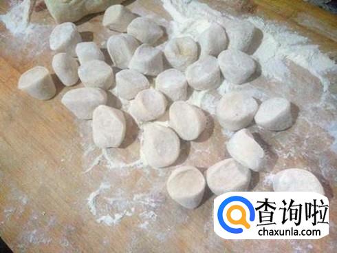 接着就是包饺子的过程了,把面团搓成长条,切成一个个的小面团。