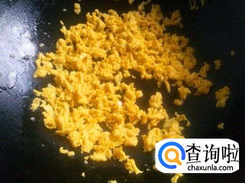 鸡蛋搅成鸡蛋液后,锅里加入底油加热后,炒熟并打散。