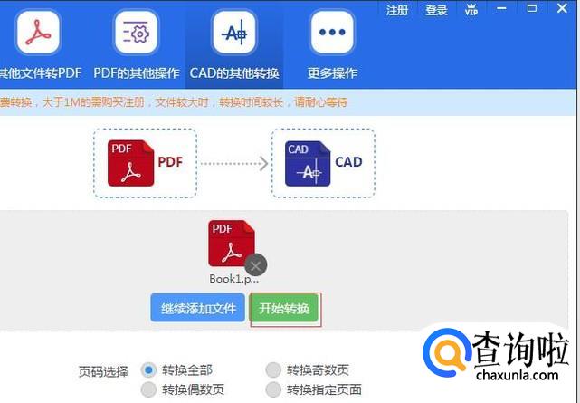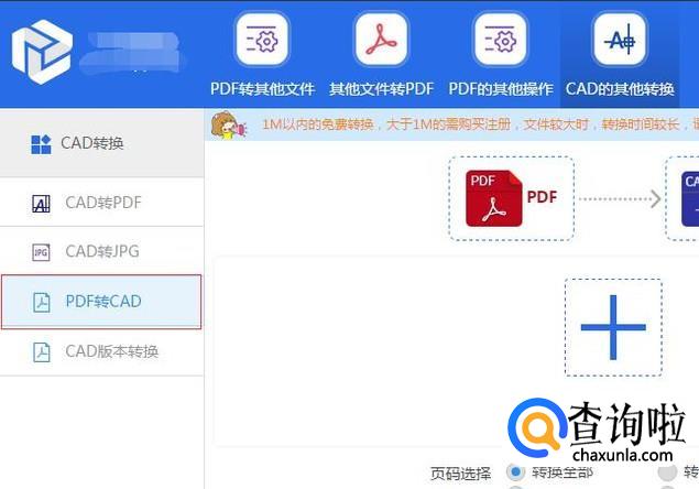 打开已经安装好的转换工具后,点击CAD的其他转换下的CAD转换下的PDF转CAD功能