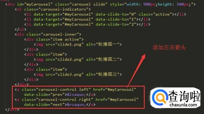 轮播图中还有一个必不可少的元素就是左右箭头,通过Bootstrap的carousel-control样式添加轮播图箭头,如下图所示