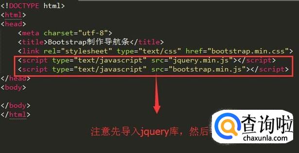 接下来我们需要导入脚本文件,注意先导入Jquery文件,然后导入bootstrap的脚本文件,顺序一定不能颠倒,如下图所示
