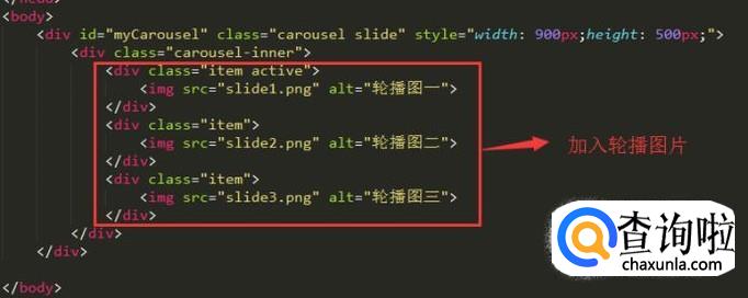 接下来我们就正式的添加轮播图了,这里先添加三张图,如下图所示,注意让哪种轮播图显示直接调用Bootstrap的active样式即可