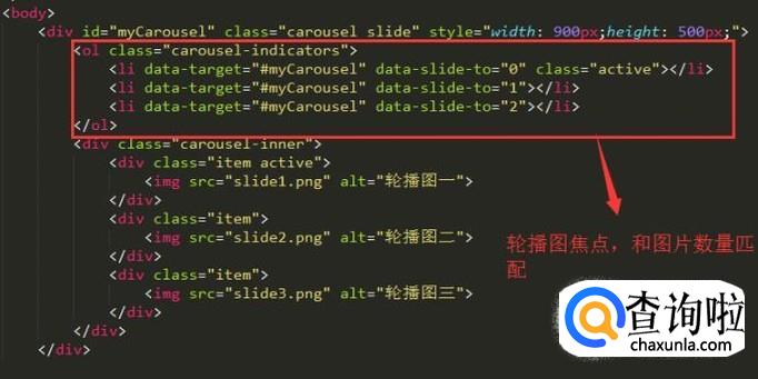 轮播图片添加完毕以后,就可以添加轮播图焦点了。在Bootstrap中运用li列表定义轮播图焦点,注意焦点的数量和图片的数量要一样,如下图所示