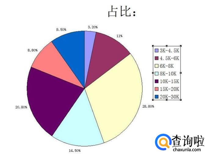 以北京为例,3000到4500之间的占了3.2%,4500到6000的占了11%,6000到8000的占了最多数,28.8%,8000到10000的占了14.5%,10000到15000的占了20.8%,15000到20000占了8.8%,20000到30000占了9.5%。