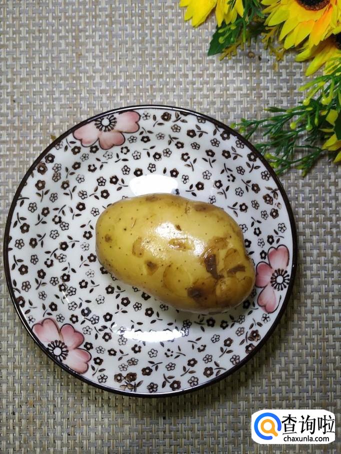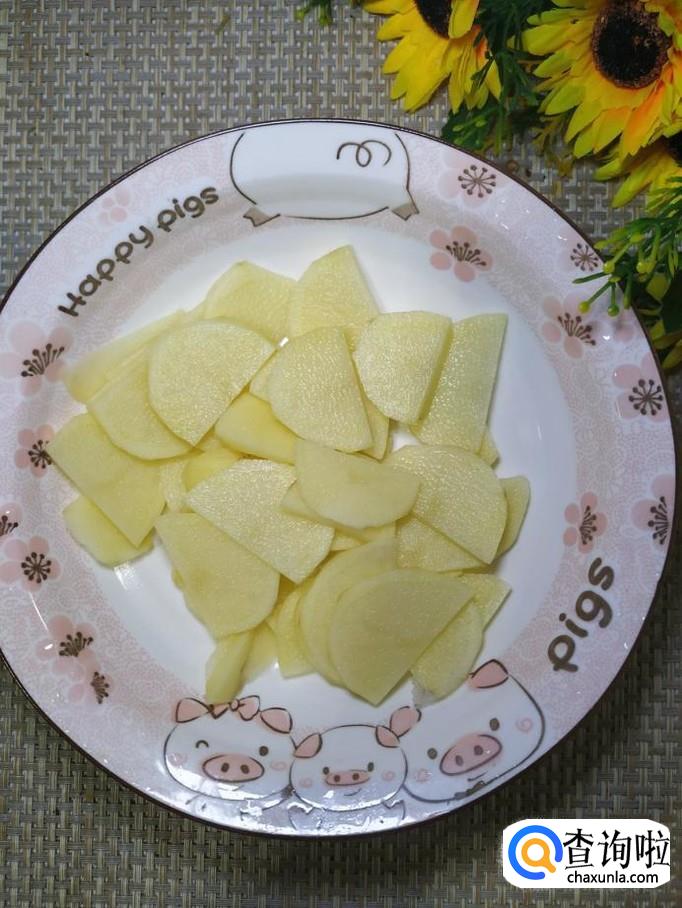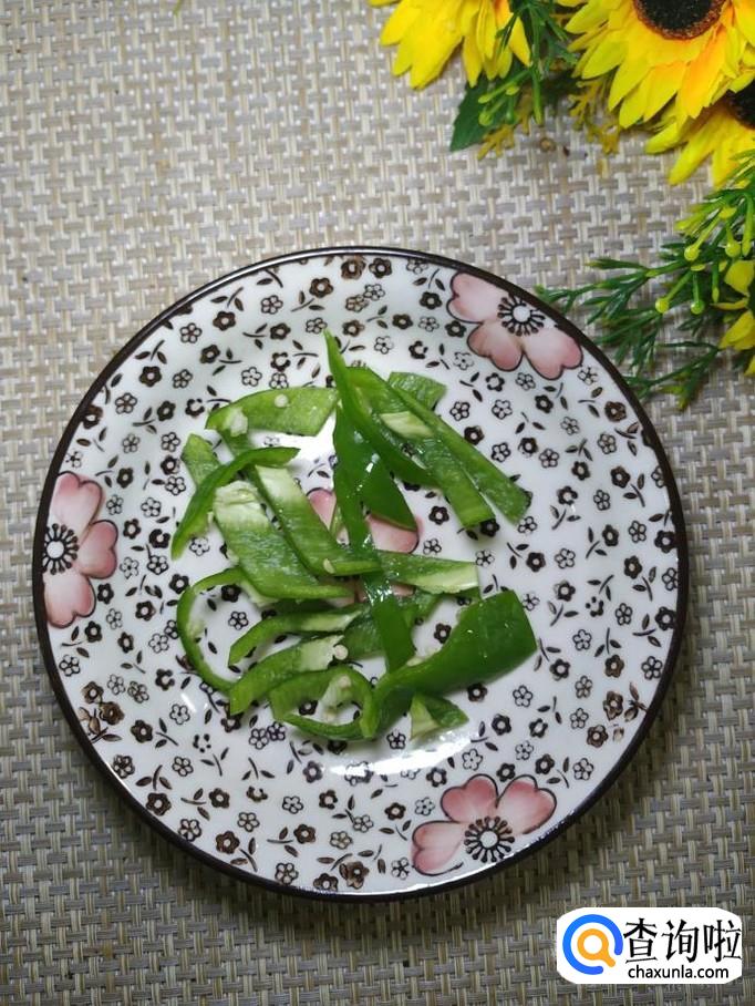 准备适量土豆,洗净去皮后,切成片,洗去淀粉,放入盘中备用,再准备适量青椒,洗净后切成丝,放入盘中备用。