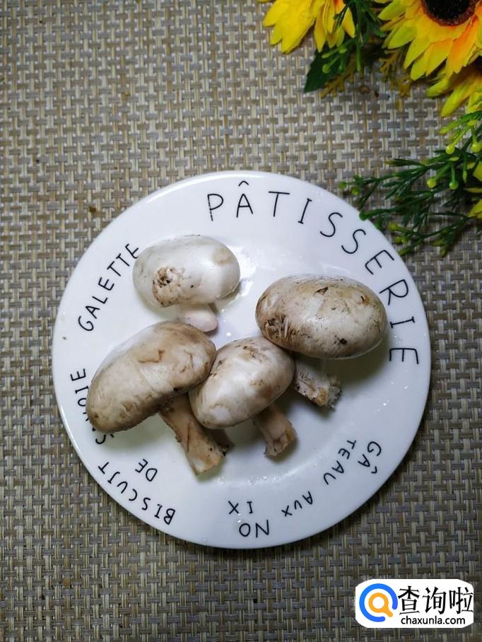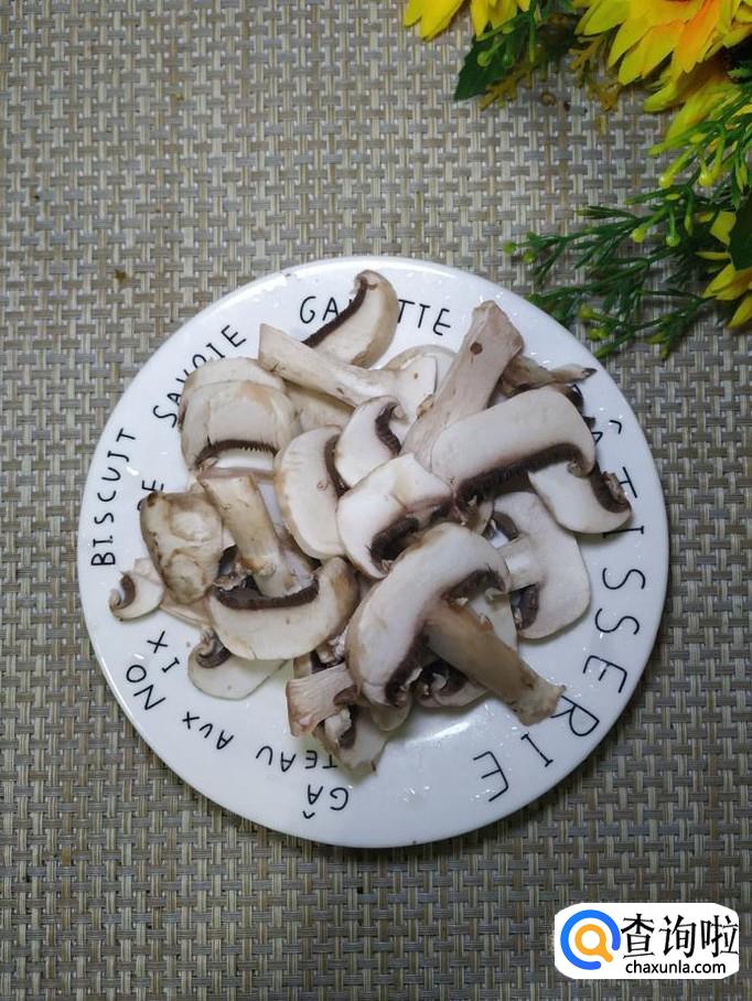 准备适量口蘑,洗净后,去除根部,切成片,放入盘中备用。
