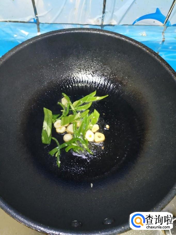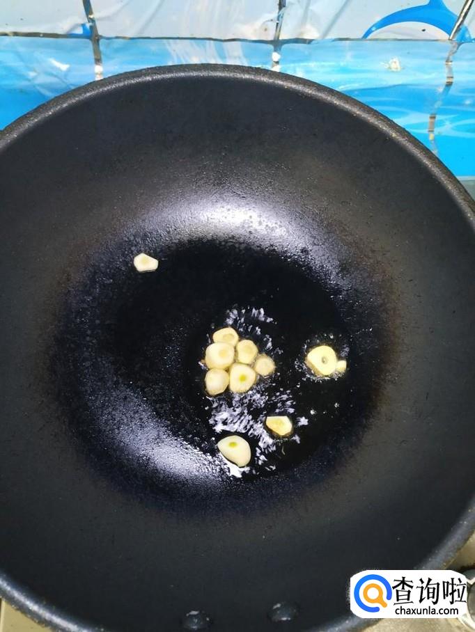 准备适量大蒜,去除外衣,切片备用,炒锅中放入适量油,油热后,放入蒜片爆香,然后将青椒丝倒入锅中,翻炒均匀。