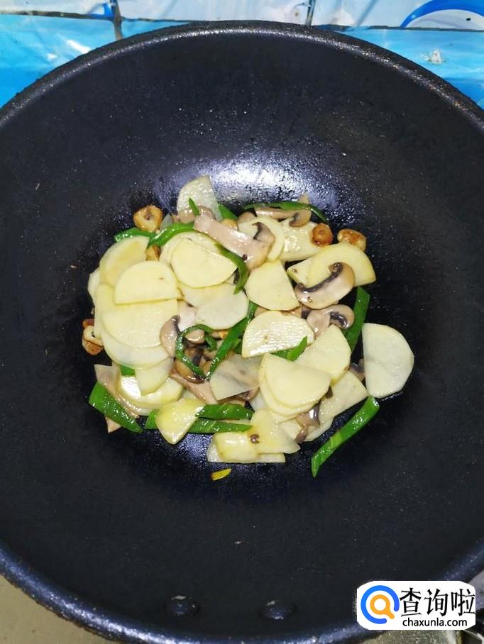 将切好的口蘑倒入锅中,和青椒丝一起翻炒均匀。
