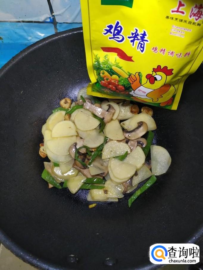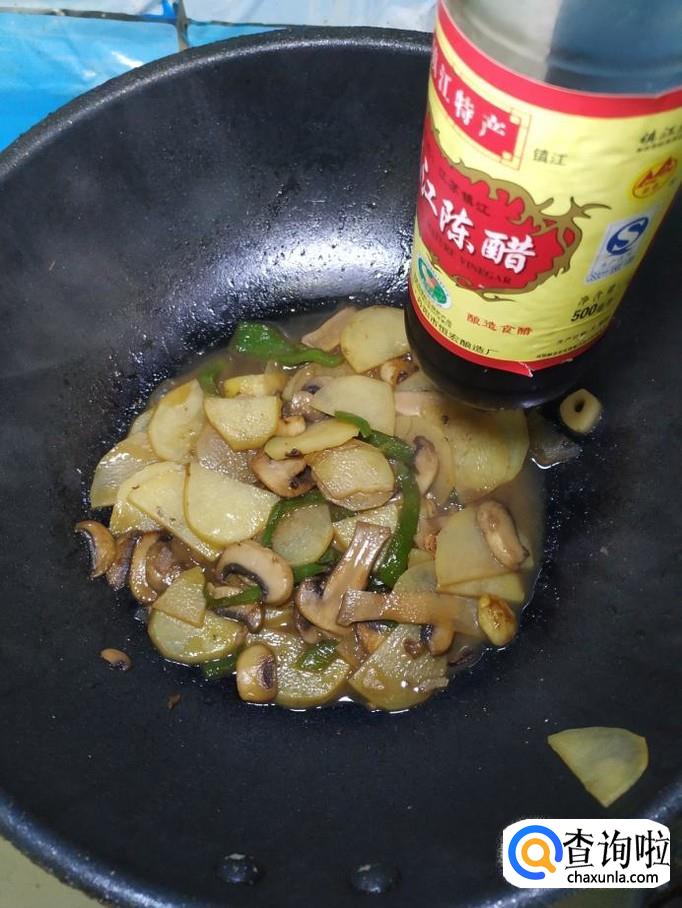 口蘑适量,土豆适量,青椒适量,蒜适量,盐适量,鸡精适量,五香粉适量,生抽适量陈醋适量。