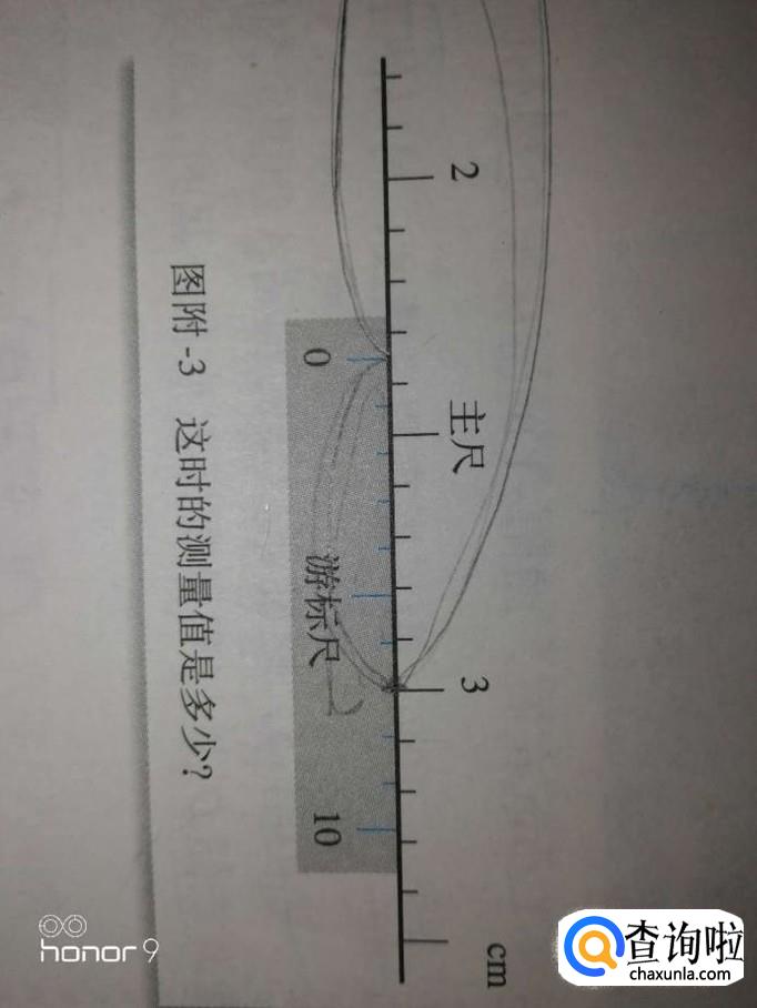 如下图,首先看副尺零刻度的位置,已经超过了2.3cm。但是余出来的一部分在主尺上无法读数,需要在副尺上读。