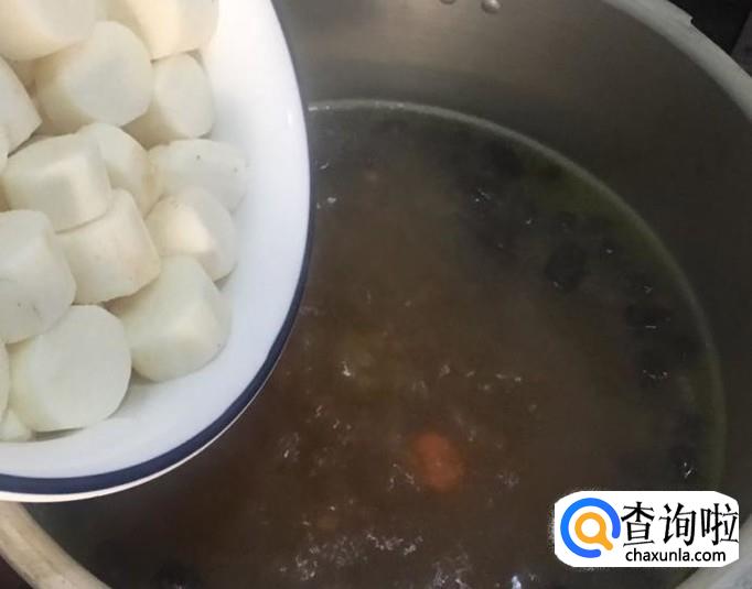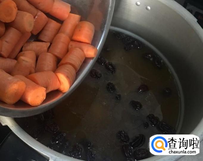 再将胡萝卜块、山药块放入汤中炖煮二十分钟。