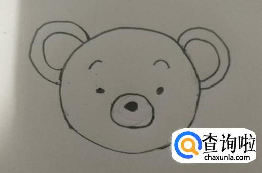 小熊的脑袋是圆圆的,所以我们首先在纸上画出一个圆形,然后在圆形里面画出小熊的眉毛、眼睛、鼻子、耳朵,小熊的脑袋就画好了。