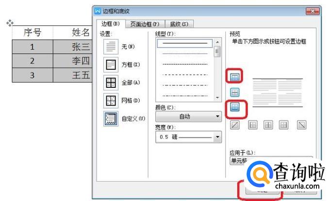 同理,把其余三行都选中,右键点击选择“边框与底纹”,并只选择上框线和下框线,把其余的线全部去掉,点击“确定”。