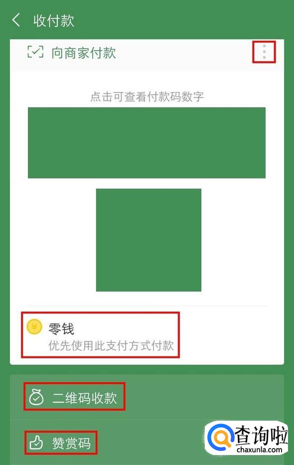 进入以后,默认显示的是付款码,右上角的三个点是一些说明以及暂停使用该功能,下方的零钱选项可以设置优先使用的支付方式,再下面就是收款码和赞赏码了;
