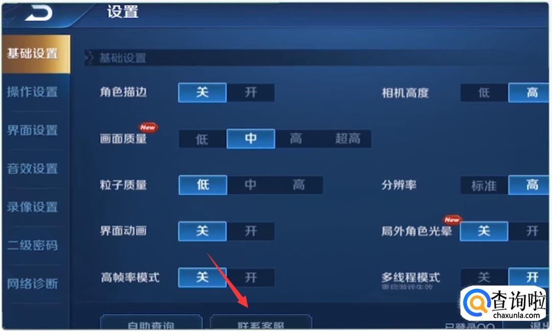在游戏界面中点击“设置”,进入设置界面后,点击“联系客服”。