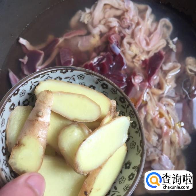 接着把生姜洗干净切成薄片,蒜头剥去外壳,倒入锅中,如下图所示。小贴士:卤制鸡杂的过程中加入生姜片和蒜头能够很好地去除鸡杂中的腥味。