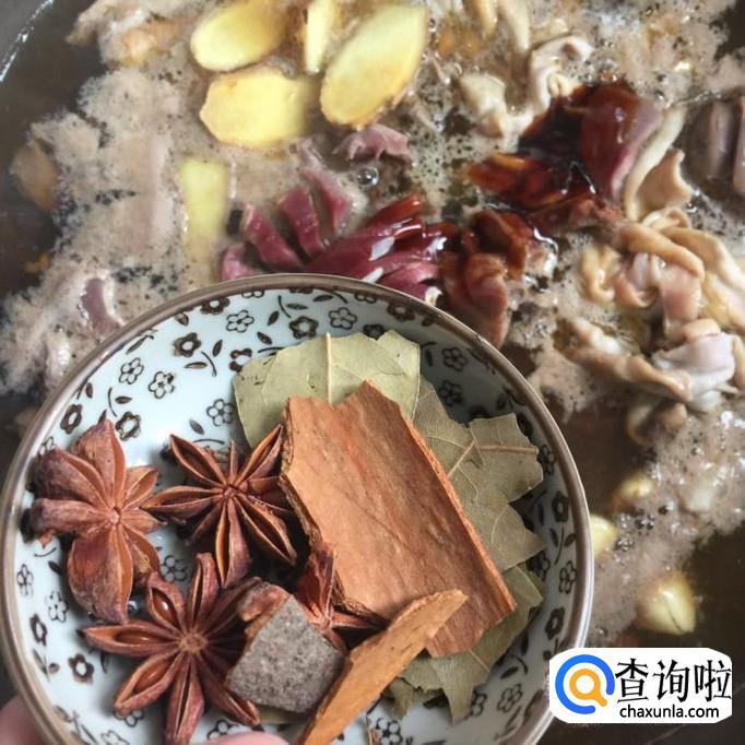 接着往锅中加入适量的桂皮,八角,香叶和花椒,开小火卤30分钟。如下图所示。小贴士:桂皮建议大家不要放的太多,放太多了会让卤出来的鸡杂变得又苦又酸,这一点大家一定要注意。