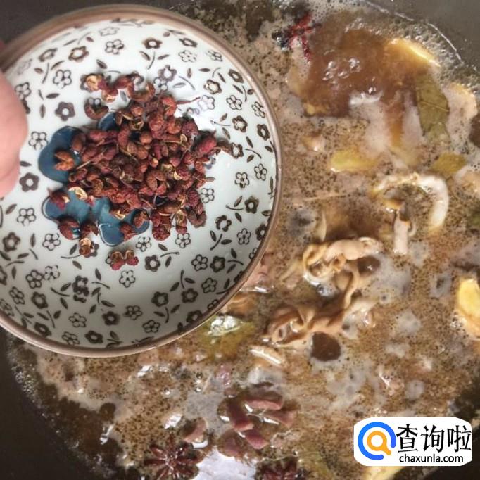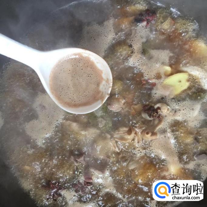 在卤制的过程当中,大家不要忘记用勺子捞去浮在表面上的浮沫,如下图所示。